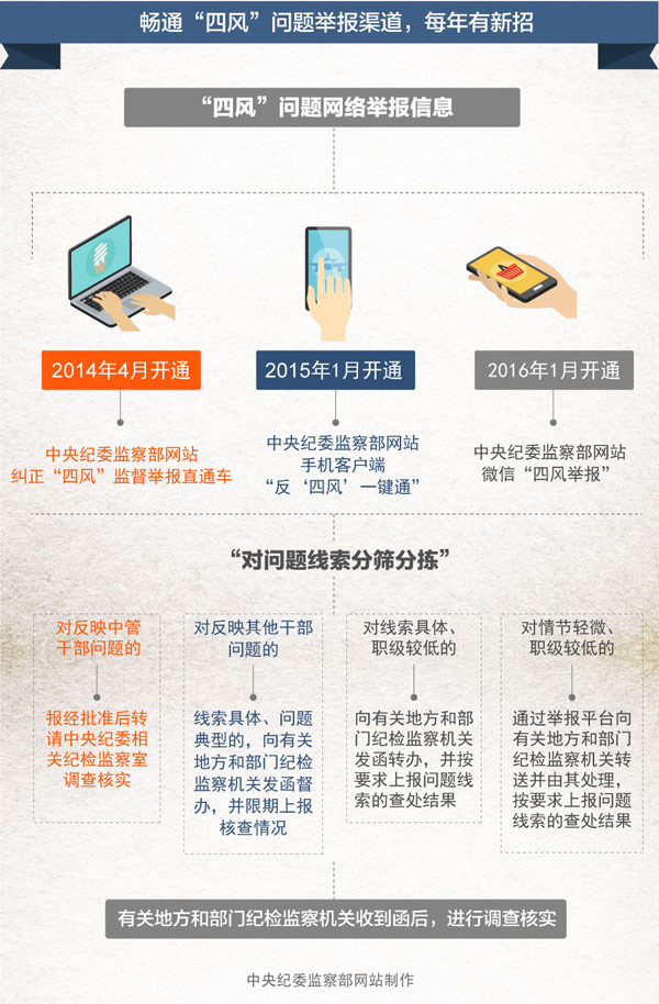 四年间,从开通网站“纠正‘四风’监督举报直通车”,到开通手机客户端“反‘四风’一键通”和微信“四风举报”平台,中央纪委监察部“一网一端一微”形成强大的监督力量;与此同时,各级纪检监察机关也搭上新媒体新技术的“快车”,开门搞监督,形成无处不在的监督网,推动了“不敢”氛围的形成。各级纪检监察机关通过强化实招、探索新招,让中央八项规定精神在不断巩固和深化中落地生根。