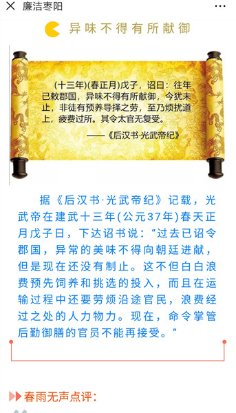 图为“廉洁枣阳”公众号开展勤廉文化宣传