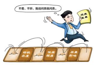 主观臆断、任性而为,此种问责背离了实事求是的原则,反映出一些领导干部政绩观错位、法规观念淡薄、程序意识不强。搞“拍脑袋”问责、凑数式问责,长此以往,基层干部便不再把问责当回事,问责成为不痛不痒的儿戏,严肃性和威慑力也就无从谈起。在一些基层单位,被问责甚至成为“家常便饭”,为应付上级的多种问责、多次问责,不管谁的责任、什么责任,由班子成员轮流分担。问责是个精细活,必须严格依规依纪依法,综合考虑动机态度、客观条件、性质程度、后果影响等情况,做到不枉不纵,一把尺子量到底。