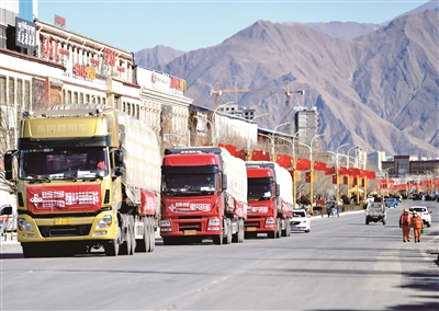 一辆辆卡车,满载着白萝卜、马铃薯、花菜、辣椒等农副产品,翻越唐古拉山,沿着青藏公路一路迎风冒雪驶向拉萨。图为来自四川的西藏农产品保供运输车队缓缓驶入拉萨市堆龙德庆区。 新华社记者 张汝锋 摄