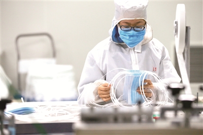 连日来,国内市场口罩、防护服等医护用品需求量剧增。图为山东省青岛市即墨区的青岛某医疗器械有限公司生产车间,工人在加紧生产口罩。