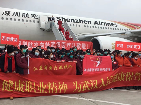 江苏支援湖北医疗队第二批139人抵达武汉天河机场。(武汉市江夏区纪委监委供 杨乐 摄)