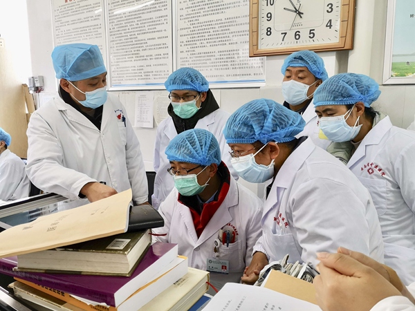 驰援咸宁的昆明医科大学第二附属医院重症医学科主任医师王刚与咸宁市第一人民医院医护人员交流患者病情。(湖北省咸宁市咸安区纪委监委供 李晖 摄)