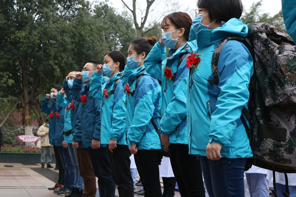 重庆市大足区人民医院10名医护人员集结宣誓后,出征支援湖北省开展新冠肺炎疫情防控和患者救治工作。(重庆市大足区纪委监委供 瞿波 摄)