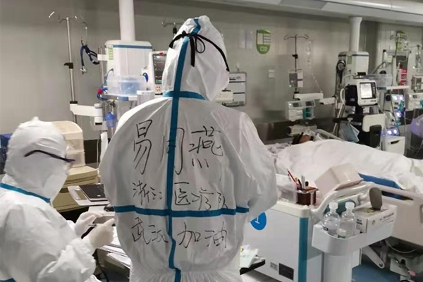 2月10日,浙江省苍南县人民医院呼吸与危重症医学科代理护士长易同燕正在武汉市肺科医院ICU进行危重患者晨间护理工作。(浙江省苍南县纪委监委供 朱静 摄)
