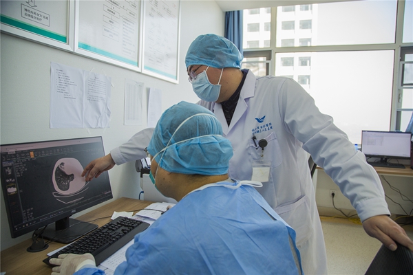 安徽抗疫医疗队与协和东西湖医院医护人员共同查看患者CT、核酸检测等检查结果,讨论重症患者病情诊疗方案,并对医嘱、病历、工作流程等提出建议。(武汉市东西湖区纪委监委供 晏君 摄)