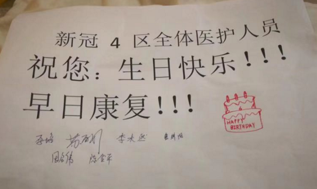 为了帮助张阿姨尽快恢复,李培依据病历记录信息,推算出了张阿姨的生日,并组织病区同事唐骄阳、李未然画了个生日蛋糕,自己跑到食堂下了一碗长寿面。等到张阿姨的治疗一做完,他们就穿着防护服来到她床前,举着一张有护士签名的“生日蛋糕”字画,画上写着:“祝你生日快乐,早日康复!”同时把一碗热气腾腾的长寿面送给张阿姨。