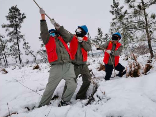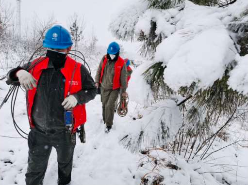 越往山里走积雪越厚,鞋子和棉服早已被冰冷的雪水浸湿,凛冽的寒风夹杂着雪花刮得脸生疼,抢修队员们深一脚浅一脚地艰难前行。12点30分,经过6个多小时的仔细排查,发现故障点位于10千伏丁王联一线线路付楼分支线21-22#杆B相断线。故障查明后,队员们立即展开紧张的抢修工作。