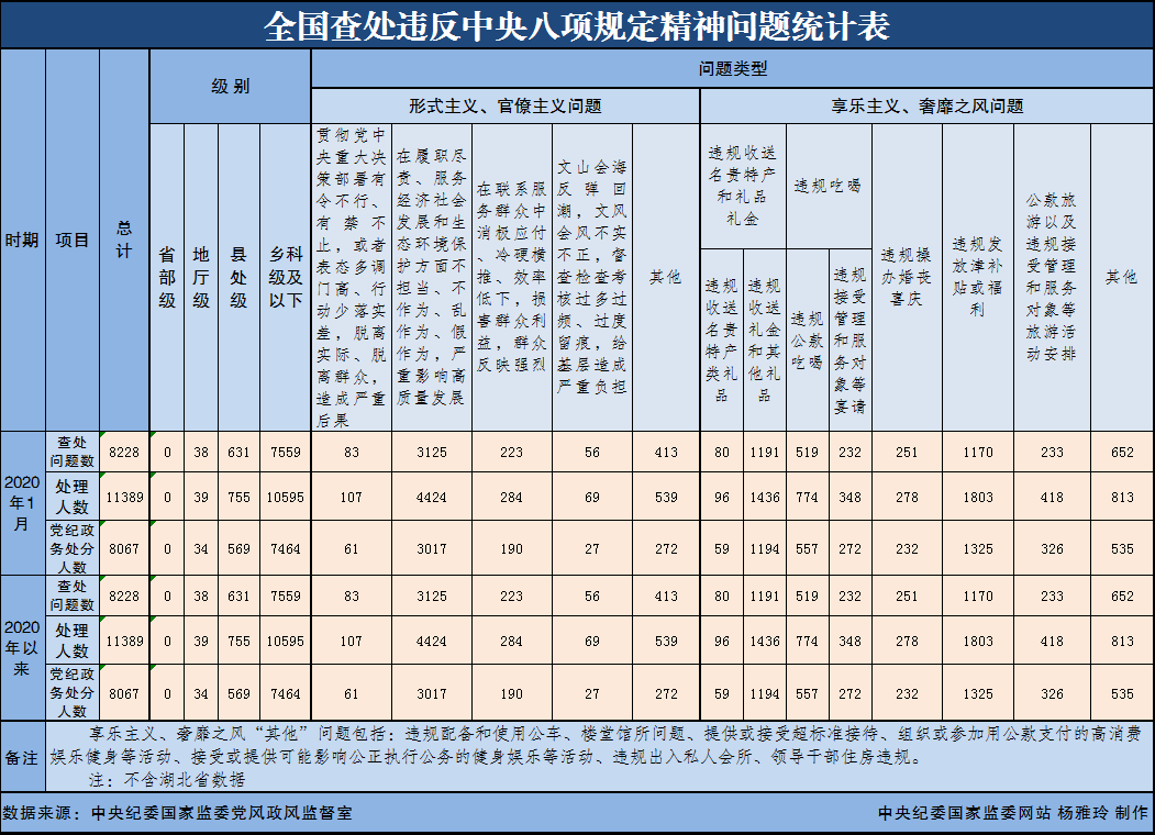 2020年1月全国查处 违反中央八项规定精神问题8228起