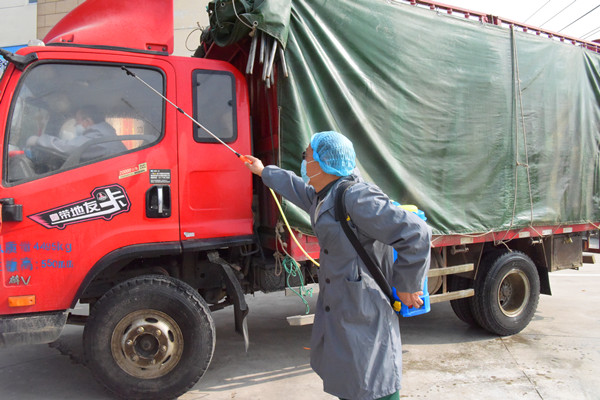 图为工作人员正对准备进入厂区的运输车辆进行消杀作业