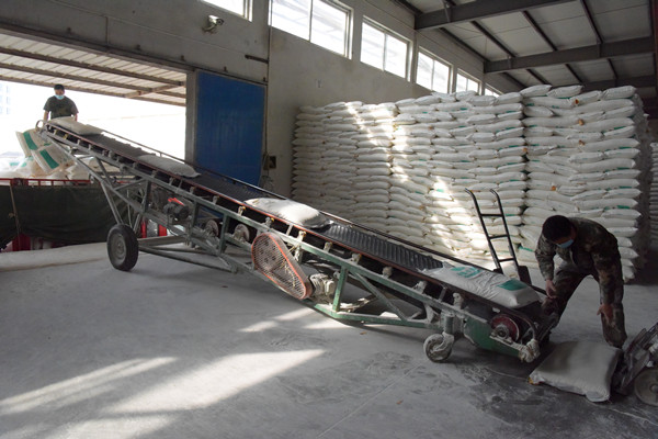 图为三杰公司工人正通过传送带将面粉送到载货卡车上