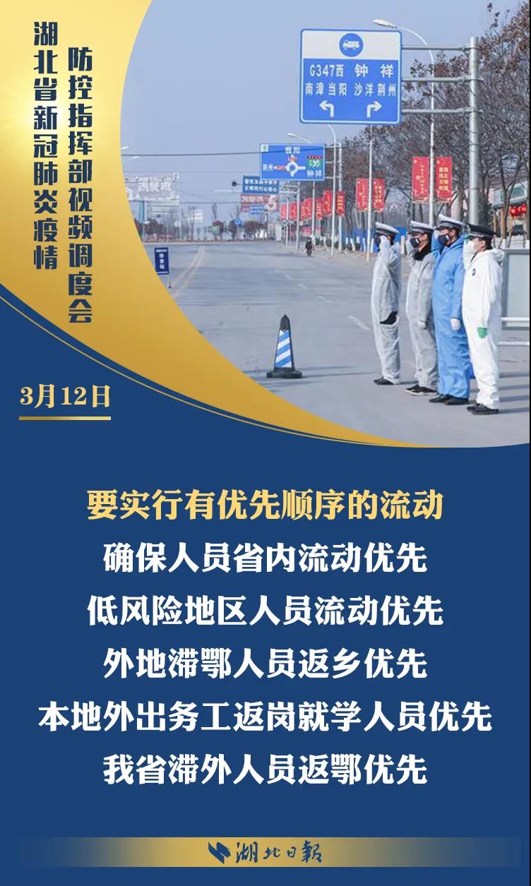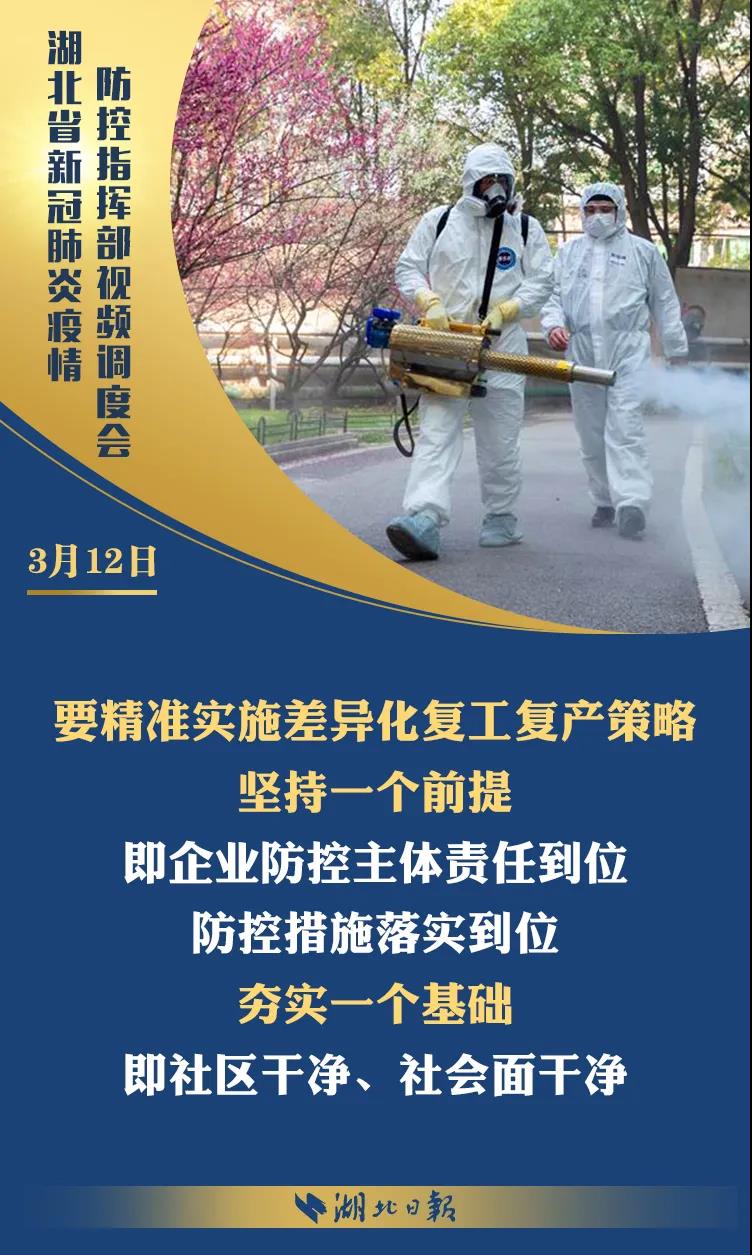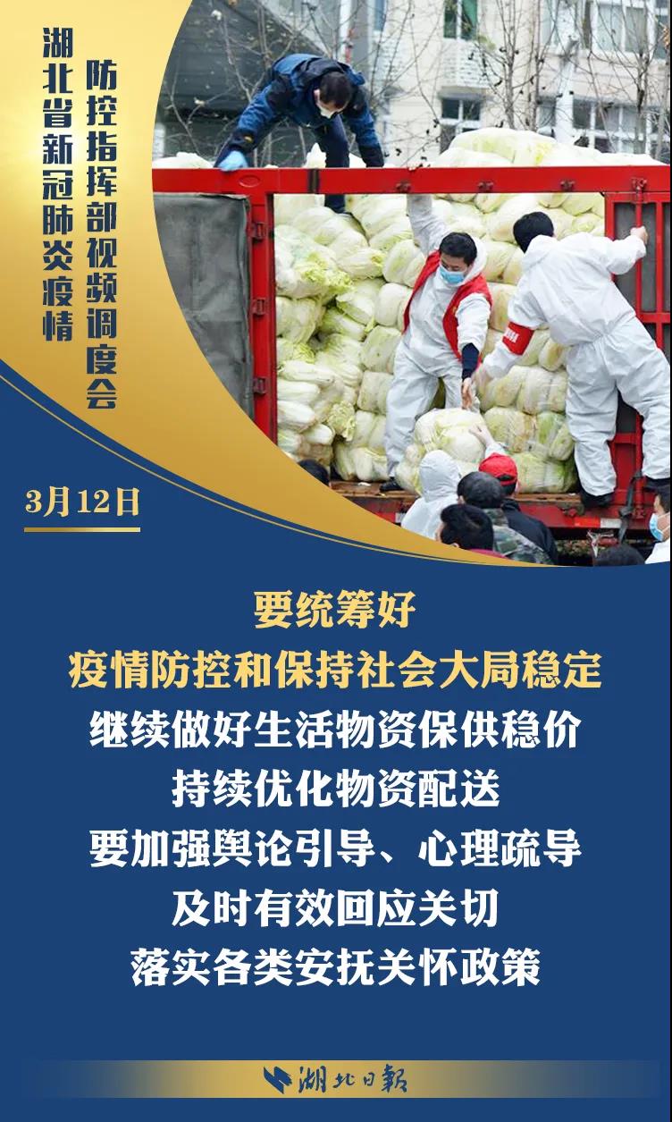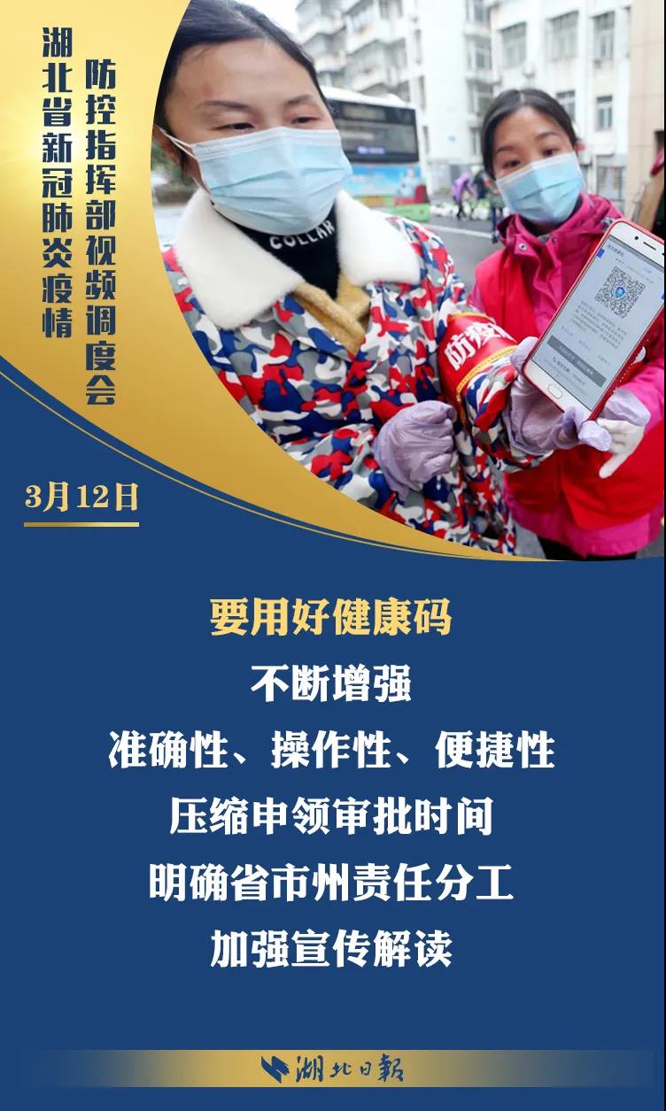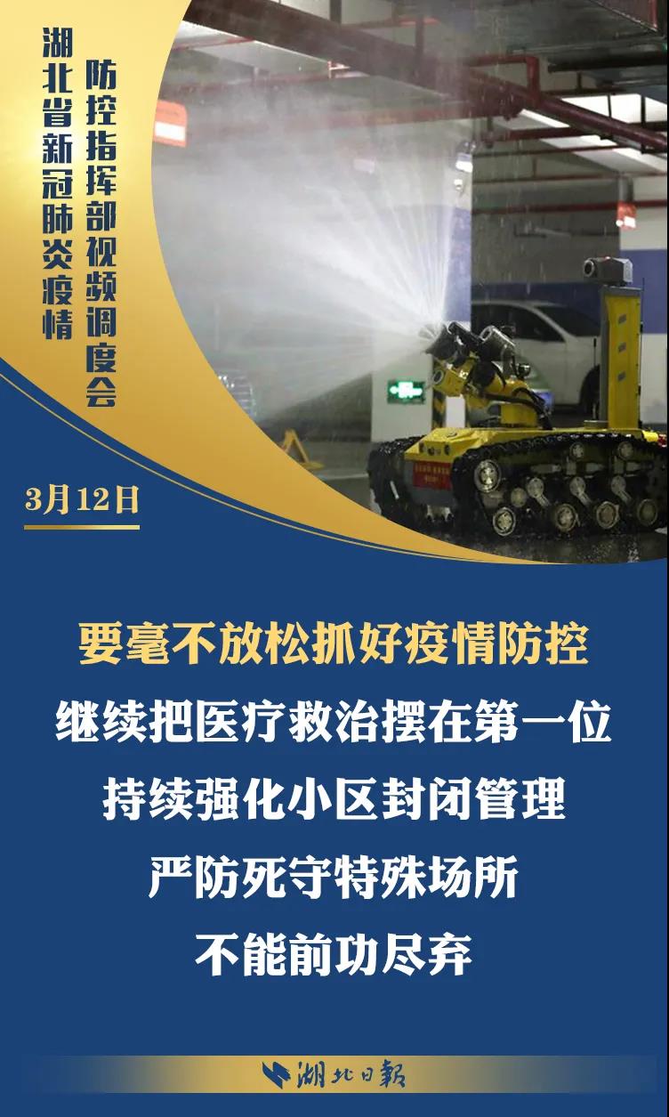 3月12日上午,省新冠肺炎疫情防控指挥部召开视频调度会,深入学习习近平总书记考察湖北重要讲话精神,传达省委常委会扩大会议意见,部署统筹推进全省疫情防控和经济社会发展工作。省委书记、省防控指挥部指挥长应勇出席会议并强调:
