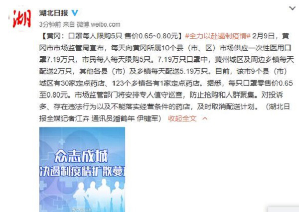 2月9日,湖北省黄冈市市场监管局宣布,每天向黄冈所属10个县(市、区)市场供应一次性医用口罩7.19万只,市民每人每天限购5只。