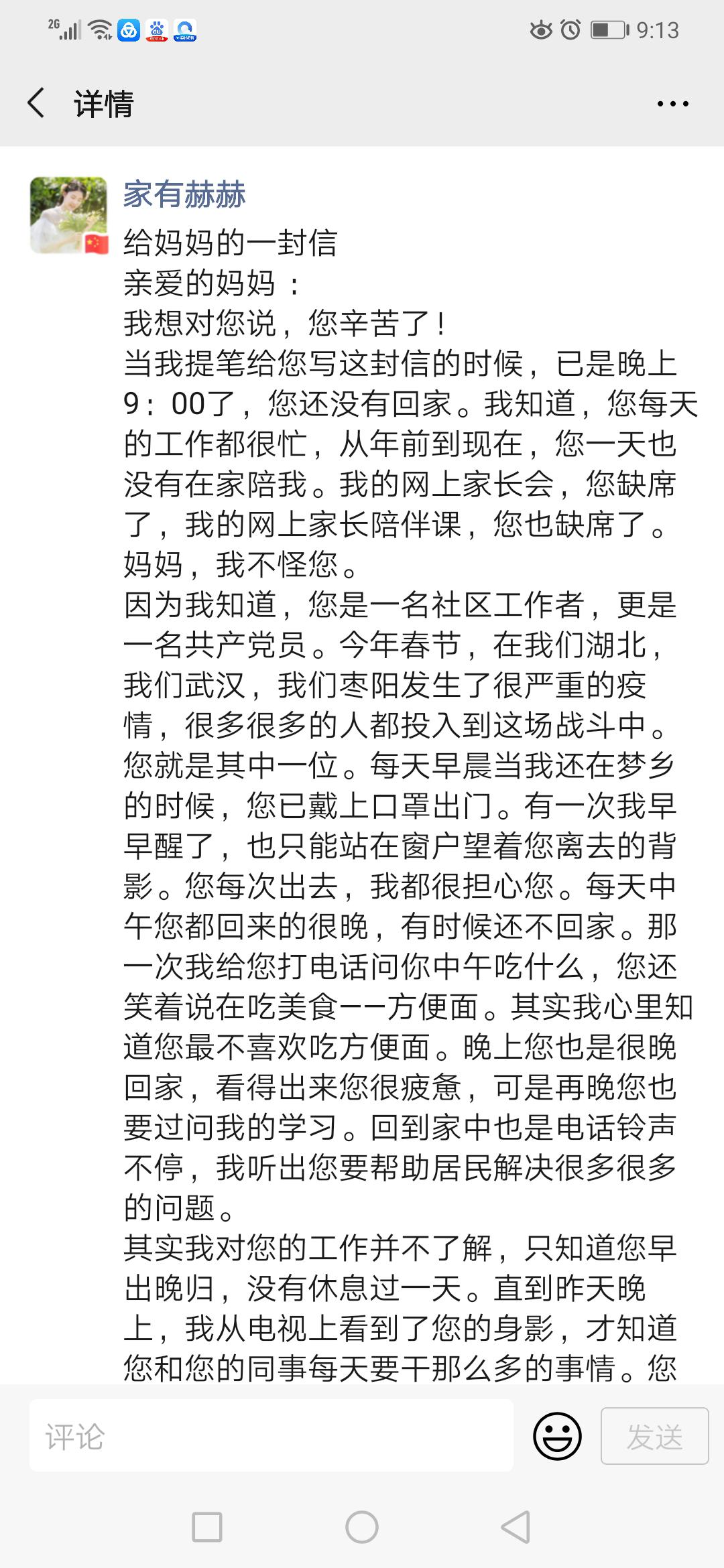 “亲爱的妈妈,您辛苦了!您每天早出晚归,没有休息过一天。直到昨天晚上,我从电视上看到了您的身影,才知道您和您的同事每天要干那么多的事情。您每天只戴着口罩这个简单的防护装备,要楼上楼下、巷东巷西,敲开一扇扇关上的门,确认每一个居民的信息;您每天需要打很多很多的电话,排查每一户居民的体温;您每天需要跑很多很多小区,为居民送去生活物资;同时您还要负责报送各种报表,处理各种各样的事情......妈妈,您放心,我和老爸是您坚强的后盾。我负责好好学习,老爸负责搞好后勤,您就好好工作吧!当我知道您所在社区没有一例确诊与疑似病例,妈妈,我为您感到骄傲!因为这里面有您的付出。妈妈,我相信我们一定能打赢这场与病毒的战争,您一定要好好防护,注意安全。加油妈妈!我们等你!”