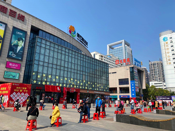 随着黄石市商超和店铺逐渐开始营业,位于城市商业中心的黄石摩尔城购物广场开始恢复生机。图为市民有序排队进入商场购物。(湖北省黄石市黄石港区纪委监委供 梅园 摄)