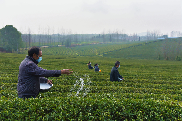 赤壁市羊楼洞茶场益阳桥分场的茶树正抽芽吐绿,茶农们抢抓有利时机分散作业,为茶树追撒春肥。该茶场6000余亩茶园将有序开展春茶采摘及生产加工作业。(湖北省赤壁市纪委监委供 张文 摄)