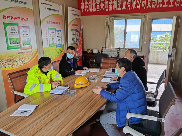 为保障农资企业复工复产,助力春耕春种,潜江经济开发区纪委联合开发区安监局,对辖区内农资供应企业复工复产和疫情防控工作开展“一对一”督导和帮扶。(湖北省潜江市纪委监委供 潜纪宣 摄)