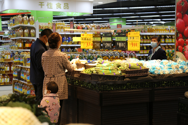 天门市内各大小超市、卖场陆续恢复营业,市民自觉遵守购买秩序,不扎堆、不聚集、戴口罩。(湖北省天门市纪委监委供 天纪宣 摄)