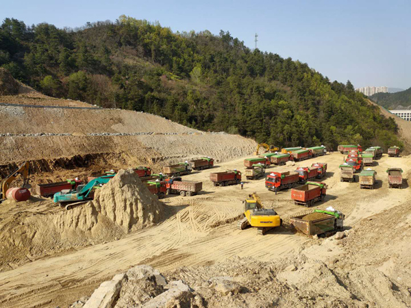 十堰市茅箭区重点项目全面复工。图为该区林荫大道一号线土方清运现场,数十辆运输车来回穿梭,恢复了往日繁忙景象。(湖北省十堰市茅箭区纪委监委供 秦道程 摄)