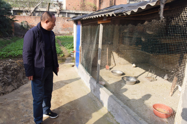 图为金国江查看贫困户家扶贫鸽子养殖情况