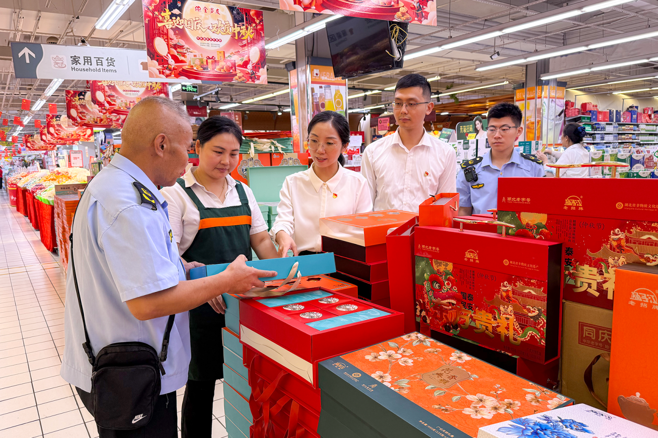 该市纪委监委立足“监督的再监督”职能定位,联合市场监管部门,对辖区内大型商超、特产专卖店等重点场所开展走访,督促职能部门落实监管职责,严防高价月饼、过度包装等“礼品上的歪风”,大力倡导节俭过节、廉洁过节新风尚。图为该市北城街道办事处纪工委联合市场监管部门在辖区超市走访了解相关情况。