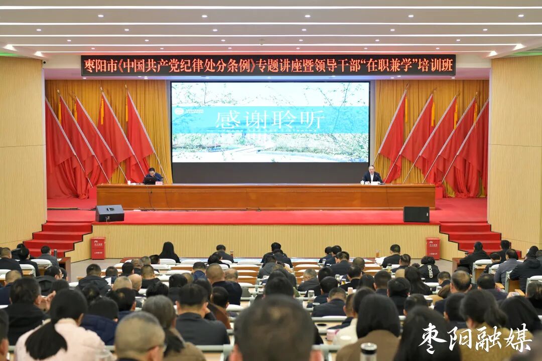 1月12日,我市举行学习《中国共产党纪律处分条例》专题讲座暨领导干部“在职兼学”培训,深入学习贯彻习近平总书记关于党的自我革命的重要思想,坚定不移推进全面从严治党,锲而不舍落实中央八项规定精神,常抓不懈推进作风建设常态化长效化,知责于心、担责于身、履责于行,持续营造风清气正、干事创业的良好政治生态。受襄阳市委常委、枣阳市委书记杨晶委托,市委副书记、市长孔令波主持学习并讲话。市人大常委会主任谢正旺,市政协主席孙襄林,市委副书记张少卿,枣阳经开区党工委副书记、管委会主任康丹等参加学习。