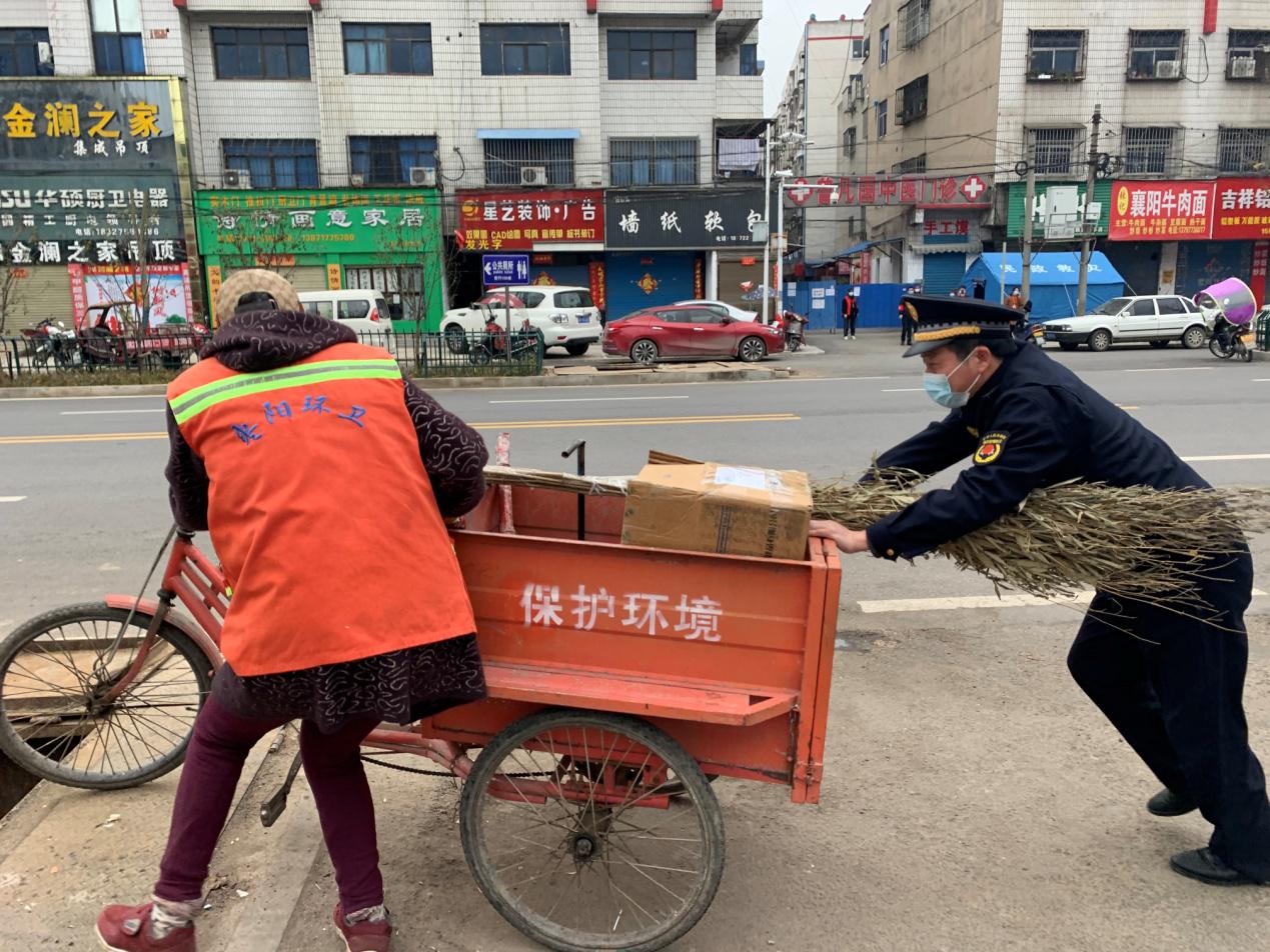 “大姐,是车轱辘掉进去了吗?我来帮您…”巡逻队成员区城管中队姚斌看到一位环卫大姐三轮车前轮掉进了垃圾箱,急忙赶去帮忙。“疫情期间,封闭区产生了大量的生活垃圾,我们城管人员巡逻期间不仅仅要劝返人员、检查人员车辆出行,同时也要检查各个路口看是否有垃圾存留,协同环卫工人一同清理,维护环境卫生让大家在‘解封’后,能够看到一个美丽的枣阳。”