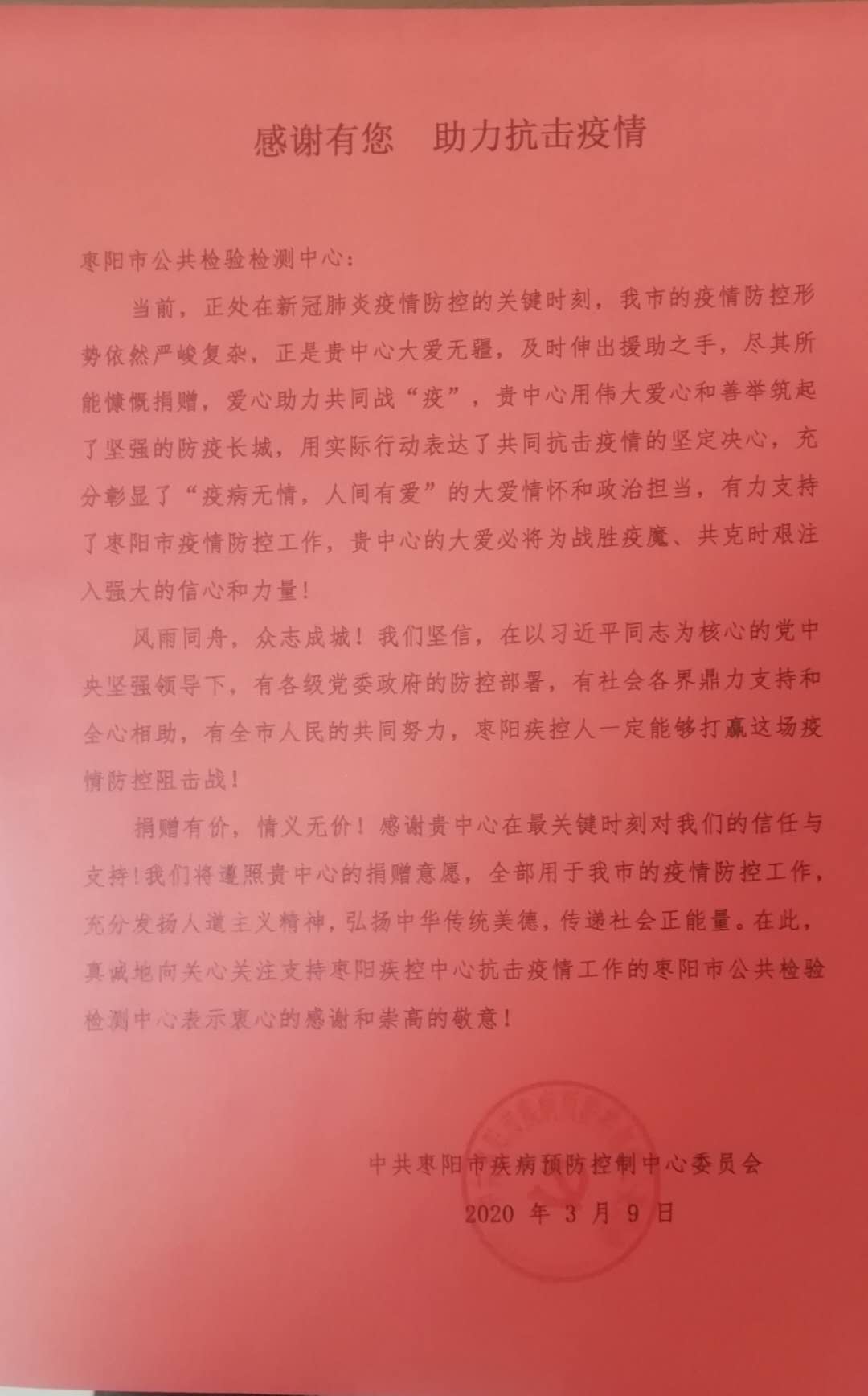 自3月9日开始,枣阳市疾控中心党委的一封封情真意切的感谢信,承载着市疾控中心全体干部职工的感激情怀,通过上门送达、微信等方式传递到社会爱心企业负责人和爱心人士手中。