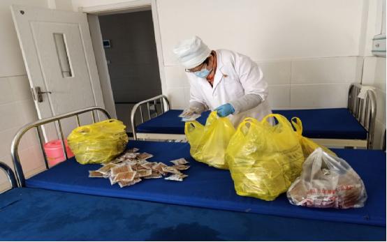 工作枯燥,却满心欢喜 清晨6点,中医科的高伶俐、张明清、袁丽云就来到了医院,打开机器开始煎药,摊凉、分装,等到8点钟,一号方剂400袋中药汤剂已装好,中药发放联络员张荣华第一时间发放到防控人员手中。继续煎二号、三号、四号方剂药。到11点钟全镇中药汤剂全部 送到防控防疫及各福利院人员手中。下午1点钟又开始煎下午的药,每天2次,,一天封装2000多人次的中药包,连续一个月,从不叫苦叫累。中医科的老大姐高伶俐说:“中医是国粹,中医药治未病,能预防新冠病毒,能为大家伙做点实事,我们心中得劲,有干头!”