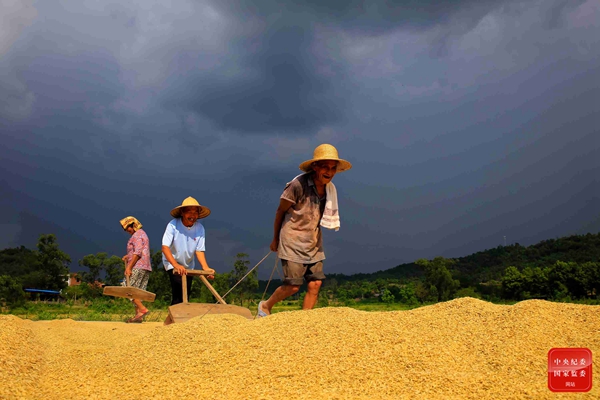 风雨将至,全家老少齐上阵忙着抢收晒场里的稻谷,确保颗粒归仓。(重庆市长寿区纪委监委 供 李炎 摄)