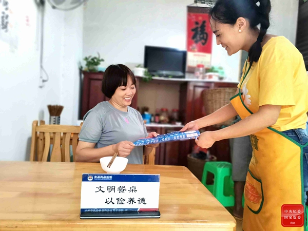 四川省泸县餐饮店商家正向就餐消费者发放《文明用餐倡议单》,提醒大家“吃多少,点多少”,鼓励打包,减少餐饮浪费。(四川省泸县纪委监委 供 李勇 摄)